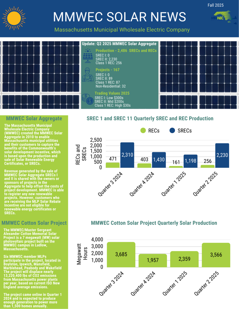 The MMWEC Solar Aggregate SREC Newsletter is published quarterly to help keep NextZero customers informed about activities related to the production and sale of Solar Renewable Energy Certificates (SRECs) generated by projects in the MMWEC Solar Aggregate.
