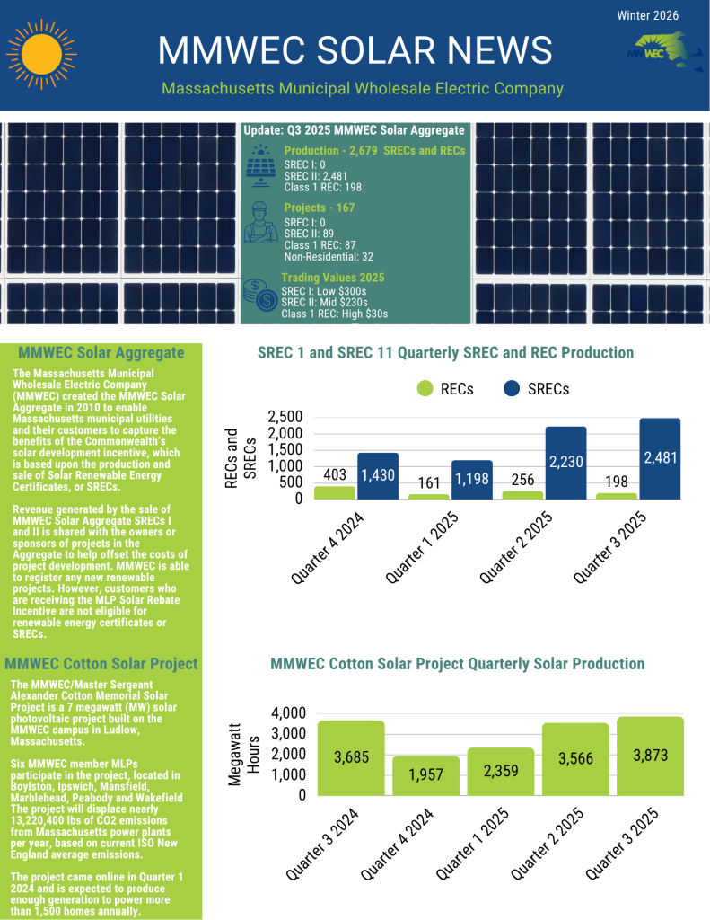 The MMWEC Solar Aggregate SREC Newsletter is published quarterly to help keep NextZero customers informed about activities related to the production and sale of Solar Renewable Energy Certificates (SRECs) generated by projects in the MMWEC Solar Aggregate.