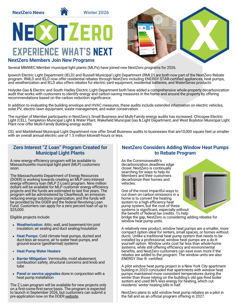 The MMWEC NextZero newsletter is published quarterly. It shares news, rebate information, and program offerings related to MMWEC’s NextZero Program for residential, and commercial and industrial municipal light plant (MLP) customers.